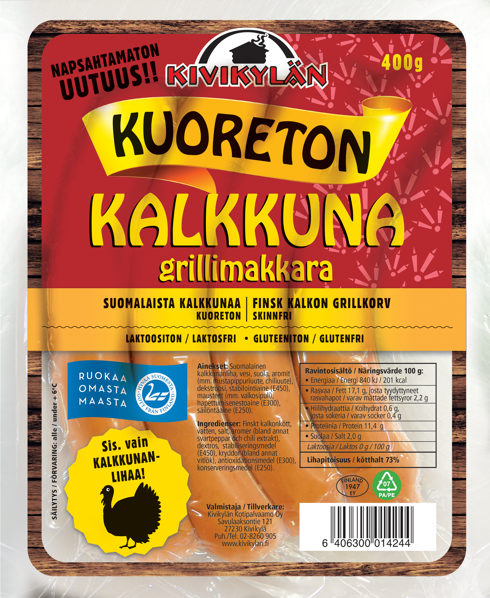 Sisältää vain suomalaista kalkkunanlihaa. Makuisan maukas kuoreton on huoleton, jonka voi pilkkoa kuorimatta vaikka suoraan keittoon, grillata normaalisti tai pistellä suuhun sellaisenaan.