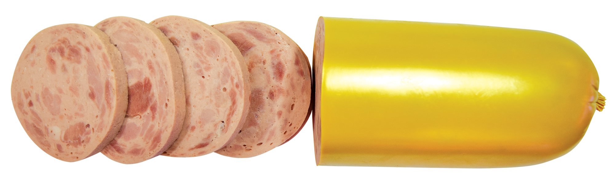 Runsaalla määrällä kinkkukuutioita varustettu maukas leikkelemakkara.