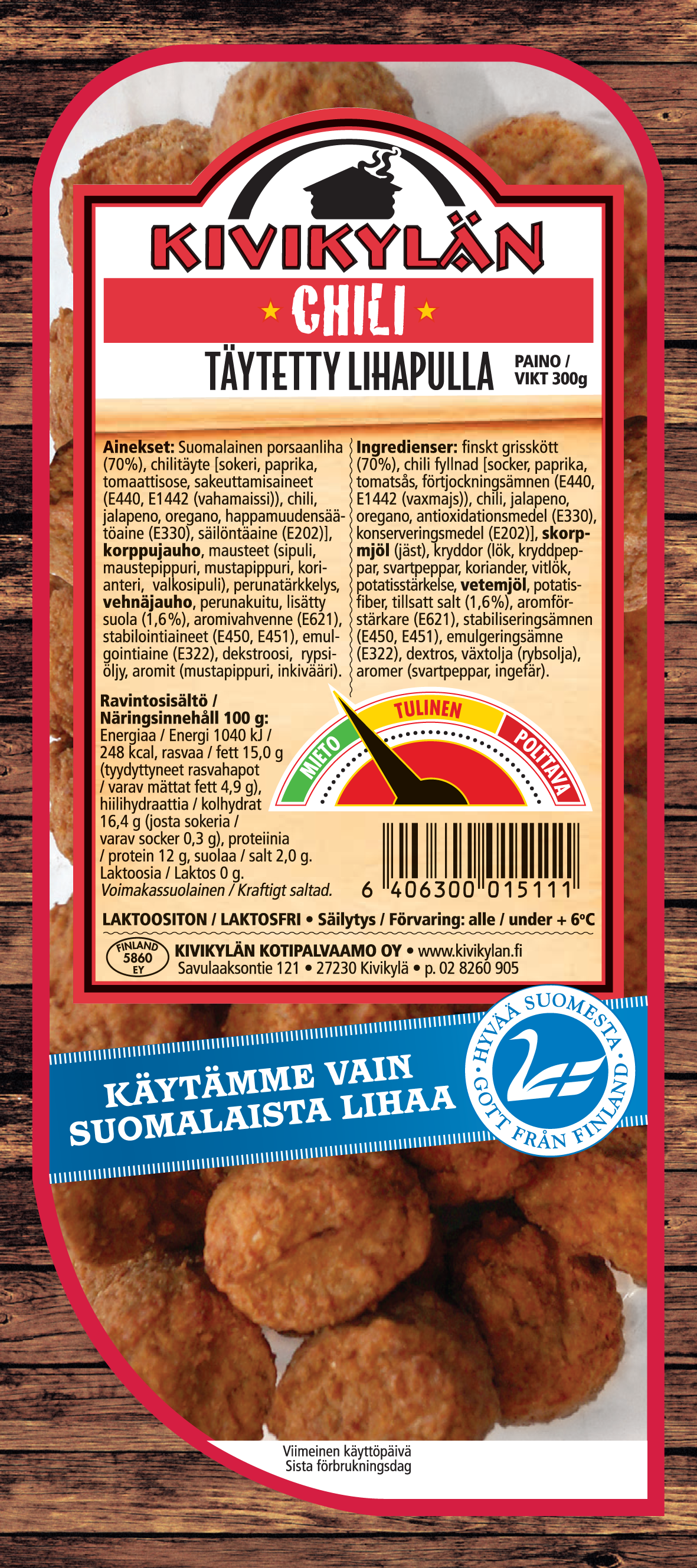 Mietoa chiliä täytettynä Palvarin Pyörykkään. Suomalainen lihapulla, suomalaiseen makuun. Kuluttajapakkauksissa 300g.
