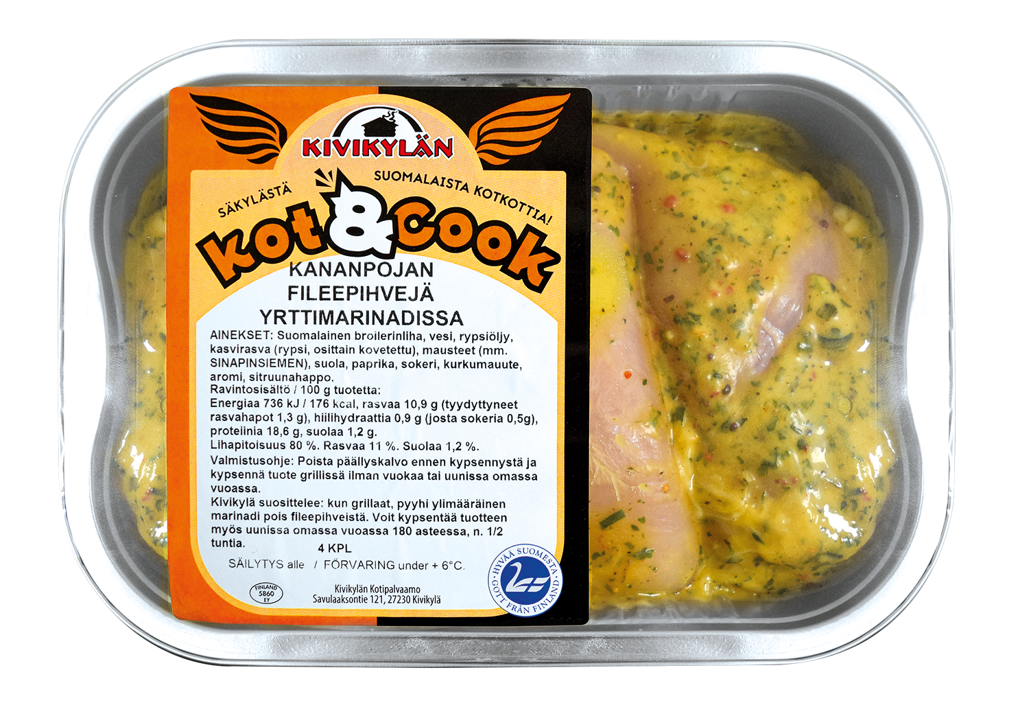 Suomalainen broilerinliha, vesi, rypsiöljy, kasvirasva (rypsi, osittain kovetettu), mausteet, (mm.sinapinsiemen), suola, paprika, sokeri, kurkumauute, aromi, sitruunahappo.