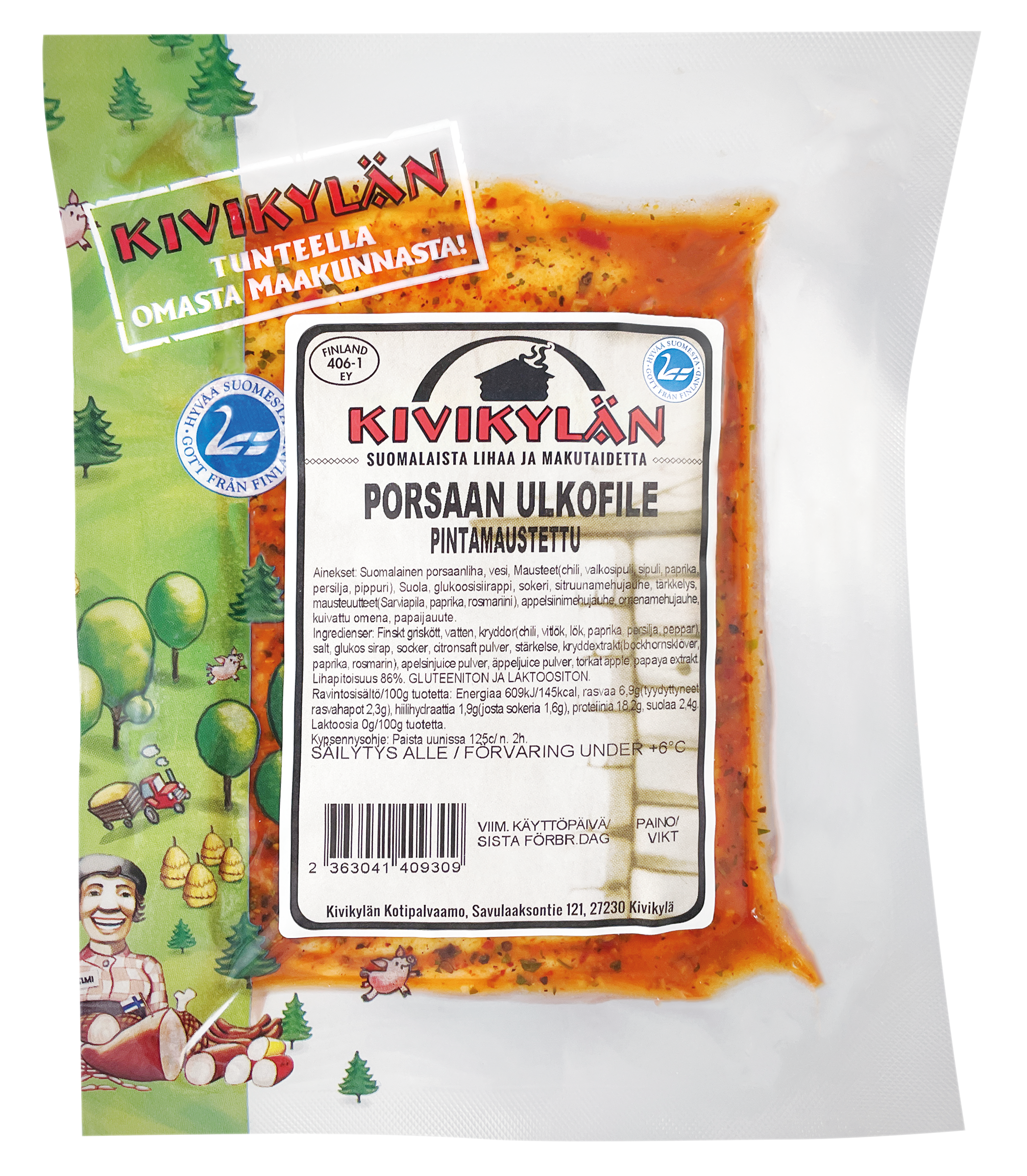 Suomalainen porsaanliha, vesi, mausteet (chili, valkosipuli, sipuli, paprika, persilja, pippuri), suola, glukoosisiirappi, sokeri, sitruunamehujauhe, tärkkelys, mausteuutteet (sarviapila, paprika, rosmariini), appelsiinimehujauhe, omenamehujauhe, kuivattu omena, papaijauute. Ingredienser: Finskt griskött, vatten, kryddor (chili, vitlök, lök, paprika, persilja, peppar), salt, glukos sirap, socker, citronsaft pulver, stärkelse, kryddextrakt (bockhornsklöver, paprika, rosmarin), apelsinjuice pulver, äppeljuice pulver, torkat äpple, papaya extrakt.