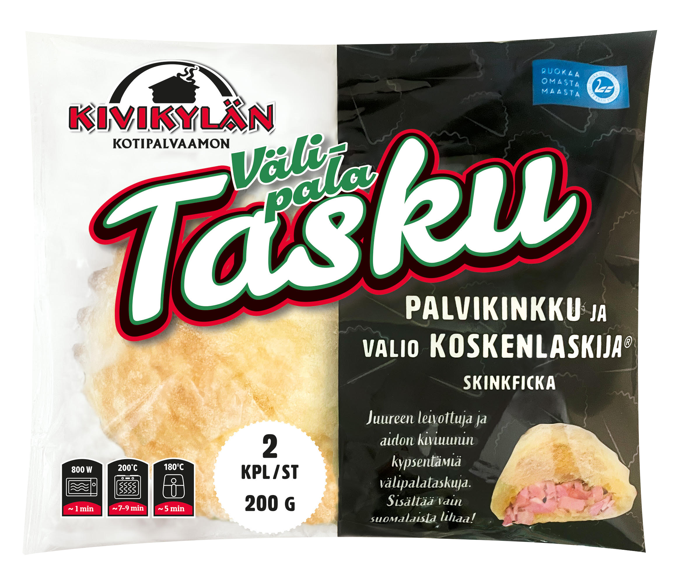 Paketissa on juureen leivottuja ja aidon kiviuunin kypsentämiä välipalataskuja 2 kpl. Sisältää Suomen parasta aidon savusaunan palvikinkkua ja Valio Koskenlaskijaa.